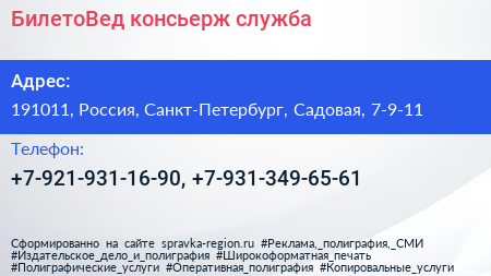 БилетоВед, консьерж-служба по адресу 191011, Россия, Санкт-Петербург, Садовая, 7-9-11 в дальнейшем Организация, размещена в следующих категориях: