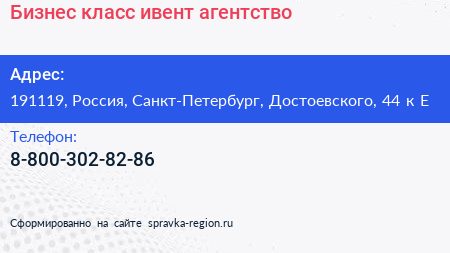 Бизнес класс, ивент-агентство по адресу 191119, Россия, Санкт-Петербург, Достоевского, 44 к Е в дальнейшем Организация, размещена в следующих категориях: