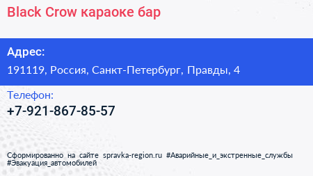 Black Crow, караоке-бар по адресу 191119, Россия, Санкт-Петербург, Правды, 4 в дальнейшем Организация, размещена в следующих категориях: