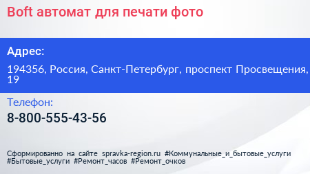 Boft, автомат для печати фото по адресу 194356, Россия, Санкт-Петербург, проспект Просвещения, 19 в дальнейшем Организация, размещена в следующих категориях: