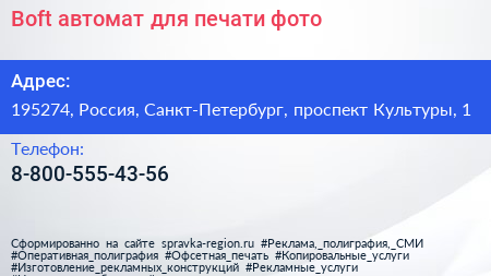 Boft, автомат для печати фото по адресу 195274, Россия, Санкт-Петербург, проспект Культуры, 1 в дальнейшем Организация, размещена в следующих категориях:
