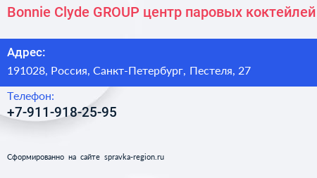 Bonnie & Clyde GROUP, центр паровых коктейлей по адресу 191028, Россия, Санкт-Петербург, Пестеля, 27 в дальнейшем Организация, размещена в следующих категориях: