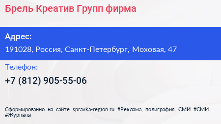 Брель Креатив Групп, фирма по адресу 191028, Россия, Санкт-Петербург, Моховая, 47 в дальнейшем Организация, размещена в следующих категориях: