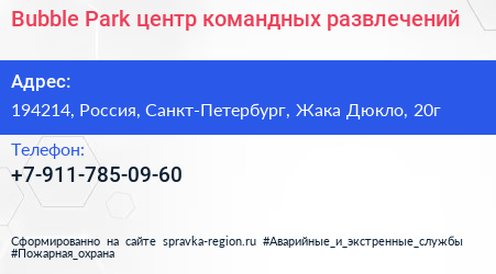 Bubble Park, центр командных развлечений по адресу 194214, Россия, Санкт-Петербург, Жака Дюкло, 20г в дальнейшем Организация, размещена в следующих категориях: