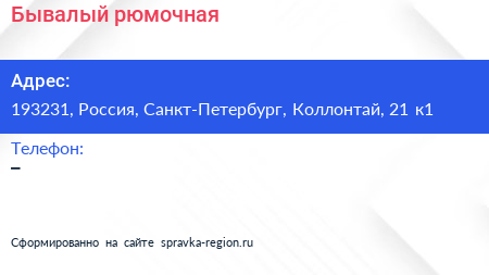 Бывалый, рюмочная по адресу 193231, Россия, Санкт-Петербург, Коллонтай, 21 к1 в дальнейшем Организация, размещена в следующих категориях: