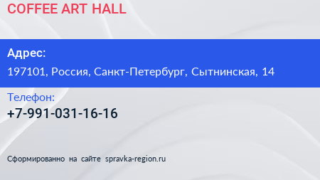 COFFEE ART HALL по адресу 197101, Россия, Санкт-Петербург, Сытнинская, 14 в дальнейшем Организация, размещена в следующих категориях: