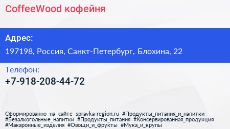 CoffeeWood, кофейня по адресу 197198, Россия, Санкт-Петербург, Блохина, 22 в дальнейшем Организация, размещена в следующих категориях: