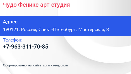 Чудо-Феникс, арт-студия по адресу 190121, Россия, Санкт-Петербург, Мастерская, 3 в дальнейшем Организация, размещена в следующих категориях: