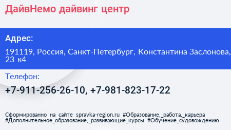 ДайвНемо, дайвинг-центр по адресу 191119, Россия, Санкт-Петербург, Константина Заслонова, 23 к4 в дальнейшем Организация, размещена в следующих категориях: