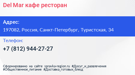 Del Mar, кафе-ресторан по адресу 197082, Россия, Санкт-Петербург, Туристская, 34 в дальнейшем Организация, размещена в следующих категориях: