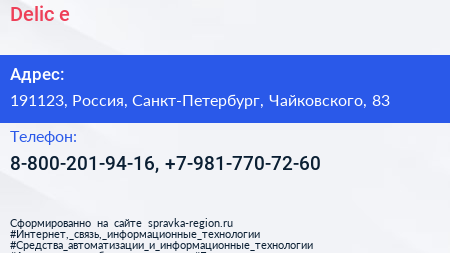 Delic`e по адресу 191123, Россия, Санкт-Петербург, Чайковского, 83 в дальнейшем Организация, размещена в следующих категориях: