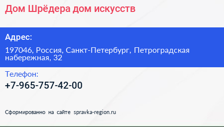 Дом Шрёдера, дом искусств по адресу 197046, Россия, Санкт-Петербург, Петроградская набережная, 32 в дальнейшем Организация, размещена в следующих категориях:
