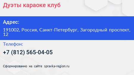 Дуэты, караоке-клуб по адресу 191002, Россия, Санкт-Петербург, Загородный проспект, 12 в дальнейшем Организация, размещена в следующих категориях: