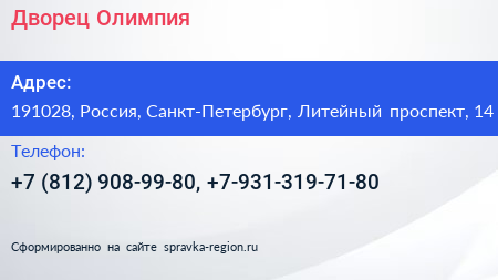 Дворец Олимпия по адресу 191028, Россия, Санкт-Петербург, Литейный проспект, 14 в дальнейшем Организация, размещена в следующих категориях: