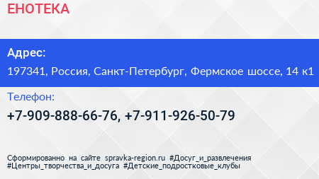 ЕНОТЕКА по адресу 197341, Россия, Санкт-Петербург, Фермское шоссе, 14 к1 в дальнейшем Организация, размещена в следующих категориях: