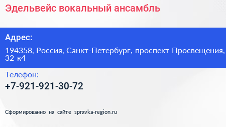 Эдельвейс, вокальный ансамбль по адресу 194358, Россия, Санкт-Петербург, проспект Просвещения, 32 к4 в дальнейшем Организация, размещена в следующих категориях: