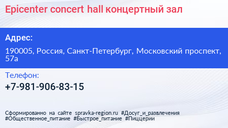 Epicenter concert hall, концертный зал по адресу 190005, Россия, Санкт-Петербург, Московский проспект, 57а в дальнейшем Организация, размещена в следующих категориях: