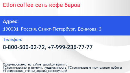 Etlon coffee, сеть кофе-баров по адресу 190031, Россия, Санкт-Петербург, Ефимова, 3 в дальнейшем Организация, размещена в следующих категориях: