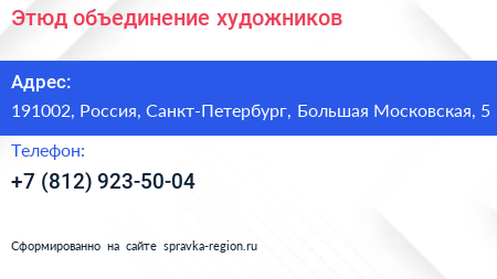 Этюд, объединение художников по адресу 191002, Россия, Санкт-Петербург, Большая Московская, 5 в дальнейшем Организация, размещена в следующих категориях: