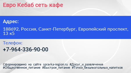 Евро Кебаб, сеть кафе по адресу 188692, Россия, Санкт-Петербург, Европейский проспект, 13 к5 в дальнейшем Организация, размещена в следующих категориях: