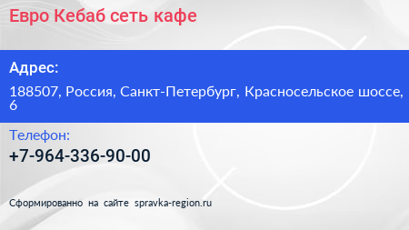 Евро Кебаб, сеть кафе по адресу 188507, Россия, Санкт-Петербург, Красносельское шоссе, 6 в дальнейшем Организация, размещена в следующих категориях: