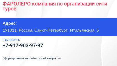 ФАРОЛЕРО, компания по организации сити-туров по адресу 191011, Россия, Санкт-Петербург, Итальянская, 5 в дальнейшем Организация, размещена в следующих категориях: