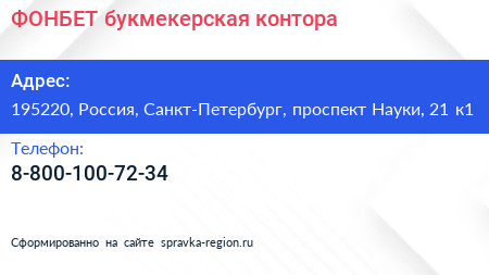 ФОНБЕТ, букмекерская контора по адресу 195220, Россия, Санкт-Петербург, проспект Науки, 21 к1 в дальнейшем Организация, размещена в следующих категориях: