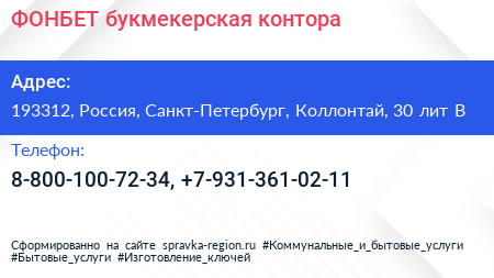 ФОНБЕТ, букмекерская контора по адресу 193312, Россия, Санкт-Петербург, Коллонтай, 30 лит В в дальнейшем Организация, размещена в следующих категориях: