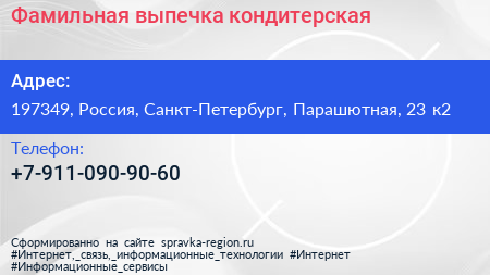 Фамильная выпечка, кондитерская по адресу 197349, Россия, Санкт-Петербург, Парашютная, 23 к2 в дальнейшем Организация, размещена в следующих категориях: