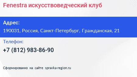 Fenestra, искусствоведческий клуб по адресу 190031, Россия, Санкт-Петербург, Гражданская, 21 в дальнейшем Организация, размещена в следующих категориях: