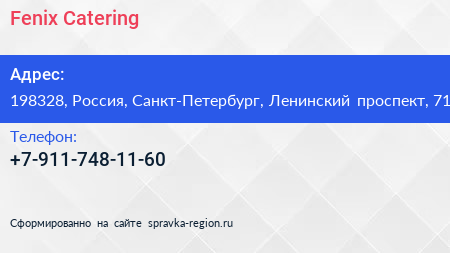 Fenix Catering по адресу 198328, Россия, Санкт-Петербург, Ленинский проспект, 71 в дальнейшем Организация, размещена в следующих категориях: