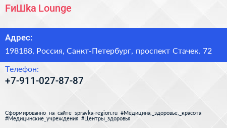 FиШka Lounge по адресу 198188, Россия, Санкт-Петербург, проспект Стачек, 72 в дальнейшем Организация, размещена в следующих категориях: