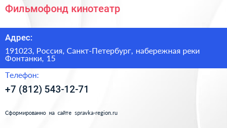 Фильмофонд, кинотеатр по адресу 191023, Россия, Санкт-Петербург, набережная реки Фонтанки, 15 в дальнейшем Организация, размещена в следующих категориях: