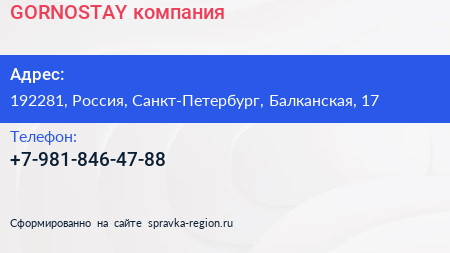 GORNOSTAY, компания по адресу 192281, Россия, Санкт-Петербург, Балканская, 17 в дальнейшем Организация, размещена в следующих категориях: