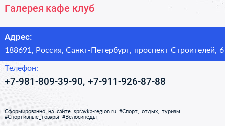 Галерея, кафе-клуб по адресу 188691, Россия, Санкт-Петербург, проспект Строителей, 6 в дальнейшем Организация, размещена в следующих категориях: