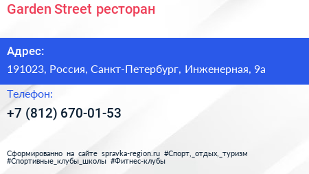 Garden Street, ресторан по адресу 191023, Россия, Санкт-Петербург, Инженерная, 9а в дальнейшем Организация, размещена в следующих категориях: