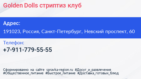 Golden Dolls, стриптиз-клуб по адресу 191023, Россия, Санкт-Петербург, Невский проспект, 60 в дальнейшем Организация, размещена в следующих категориях: