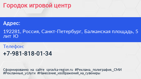Городок, игровой центр по адресу 192281, Россия, Санкт-Петербург, Балканская площадь, 5 лит Ю в дальнейшем Организация, размещена в следующих категориях: