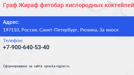 Граф Жираф, фитобар кислородных коктейлей по адресу 197110, Россия, Санкт-Петербург, Рюхина, 3а киоск в дальнейшем Организация, размещена в следующих категориях: