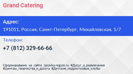 Grand Catering по адресу 191011, Россия, Санкт-Петербург, Михайловская, 1/7 в дальнейшем Организация, размещена в следующих категориях: