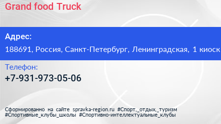 Grand food Truck по адресу 188691, Россия, Санкт-Петербург, Ленинградская, 1 киоск в дальнейшем Организация, размещена в следующих категориях: