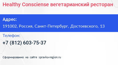 Healthy Consciense, вегетарианский ресторан по адресу 191002, Россия, Санкт-Петербург, Достоевского, 13 в дальнейшем Организация, размещена в следующих категориях: