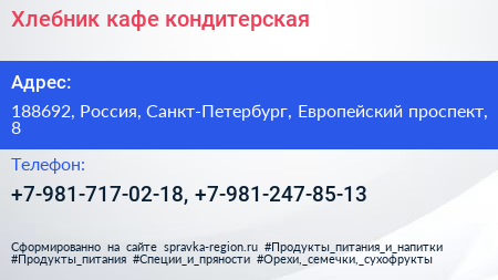 Хлебник, кафе-кондитерская по адресу 188692, Россия, Санкт-Петербург, Европейский проспект, 8 в дальнейшем Организация, размещена в следующих категориях: