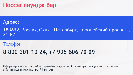 Hoocar, лаундж-бар по адресу 188692, Россия, Санкт-Петербург, Европейский проспект, 21 к2 в дальнейшем Организация, размещена в следующих категориях: