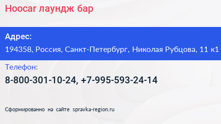 Hoocar, лаундж-бар по адресу 194358, Россия, Санкт-Петербург, Николая Рубцова, 11 к1 в дальнейшем Организация, размещена в следующих категориях: