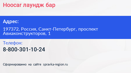 Hoocar, лаундж-бар по адресу 197372, Россия, Санкт-Петербург, проспект Авиаконструкторов, 1 в дальнейшем Организация, размещена в следующих категориях: