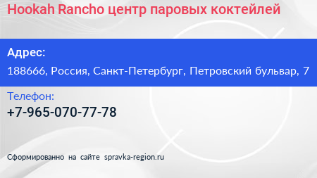 Hookah Rancho, центр паровых коктейлей по адресу 188666, Россия, Санкт-Петербург, Петровский бульвар, 7 в дальнейшем Организация, размещена в следующих категориях: