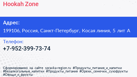 Hookah Zone по адресу 199106, Россия, Санкт-Петербург, Косая линия, 5 лит А в дальнейшем Организация, размещена в следующих категориях: