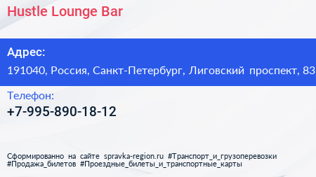 Hustle Lounge Bar по адресу 191040, Россия, Санкт-Петербург, Лиговский проспект, 83 в дальнейшем Организация, размещена в следующих категориях:
