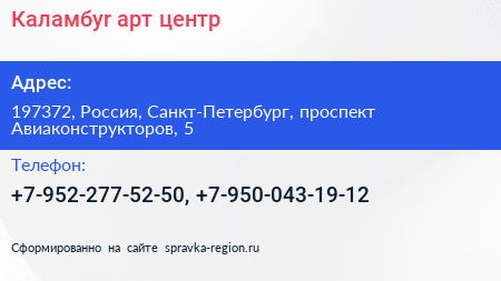Каламбуr, арт-центр по адресу 197372, Россия, Санкт-Петербург, проспект Авиаконструкторов, 5 в дальнейшем Организация, размещена в следующих категориях: